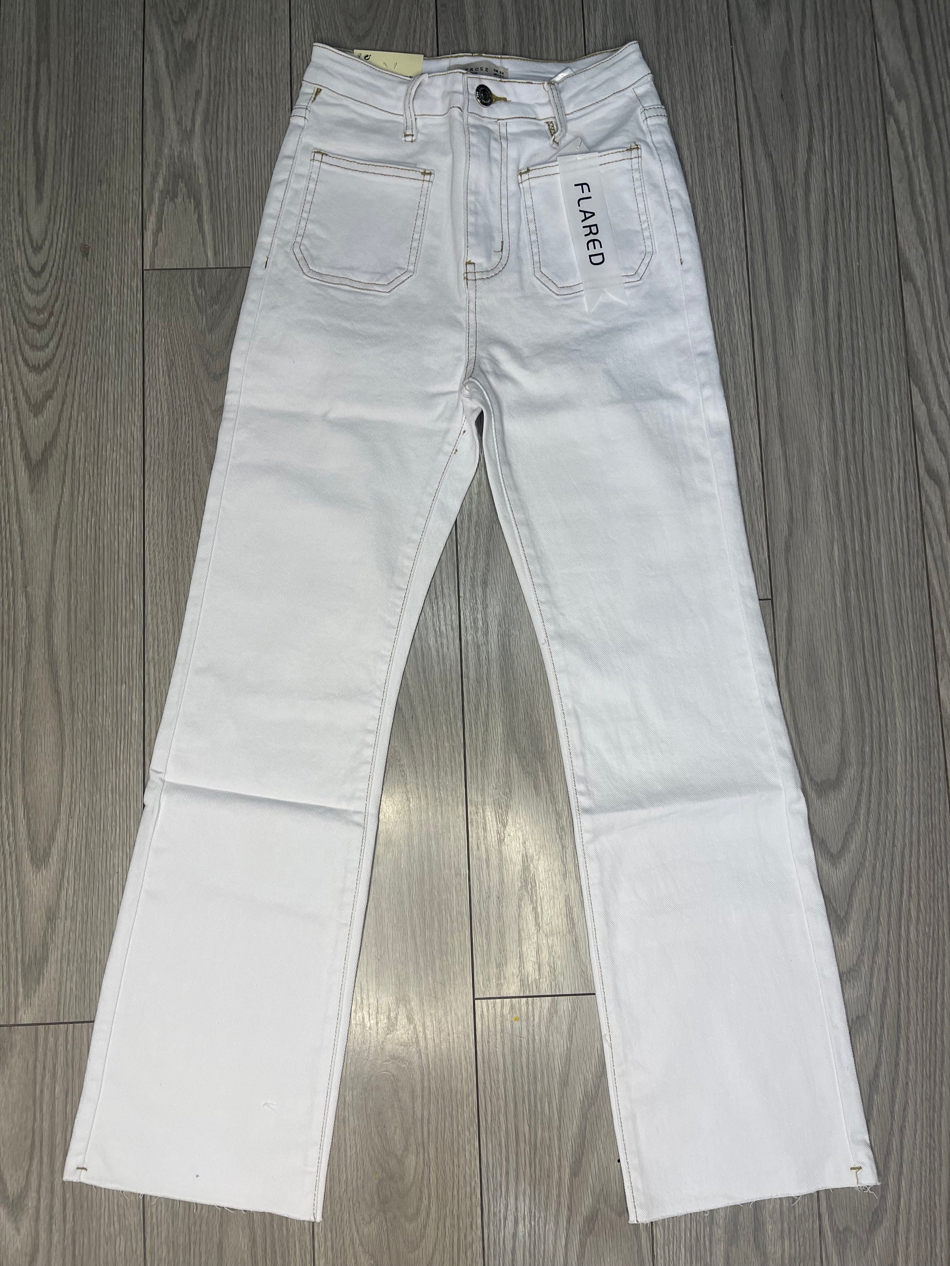 Pantalón denim blanco de mujer con corte flare, un diseño que estiliza la figura gracias a su ajuste en la cadera y su apertura progresiva desde la rodilla. Su estética limpia y actual aporta un toque retro muy favorecedor, ideal para quienes buscan un vaquero diferente y con personalidad.
